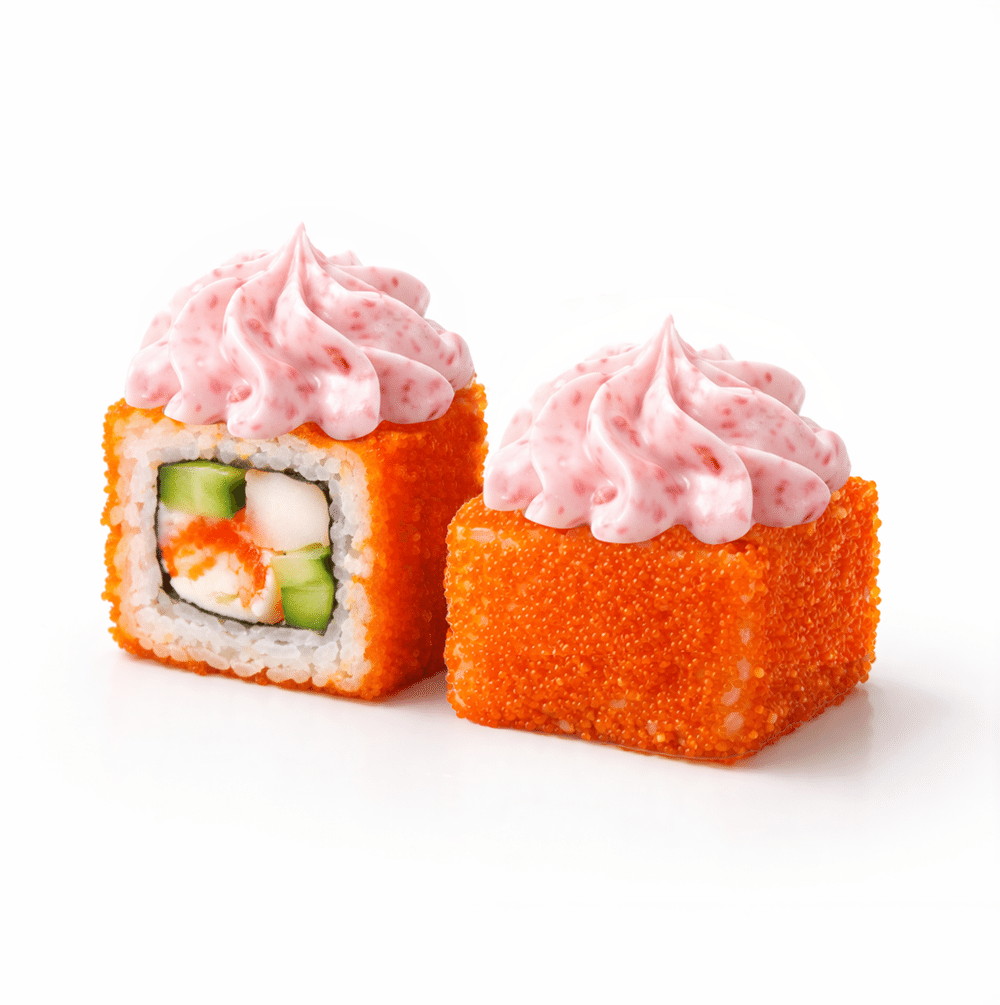 Огурец, Сурими, Сыр сливочный, Креветки, красная икра Масаго, соус Лава, нори, рис.