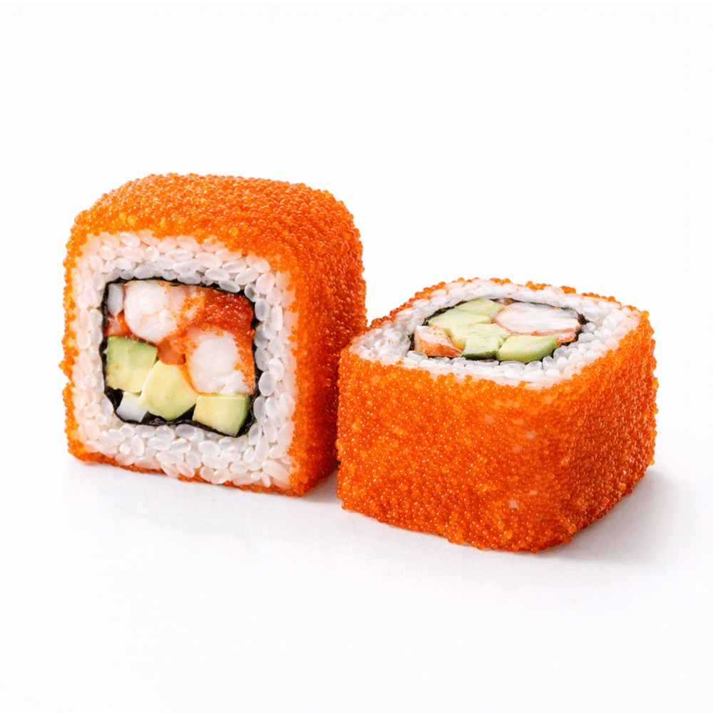 Креветки, Огурец, Майонез, Икра Масаго, Авокадо, нори, рис.