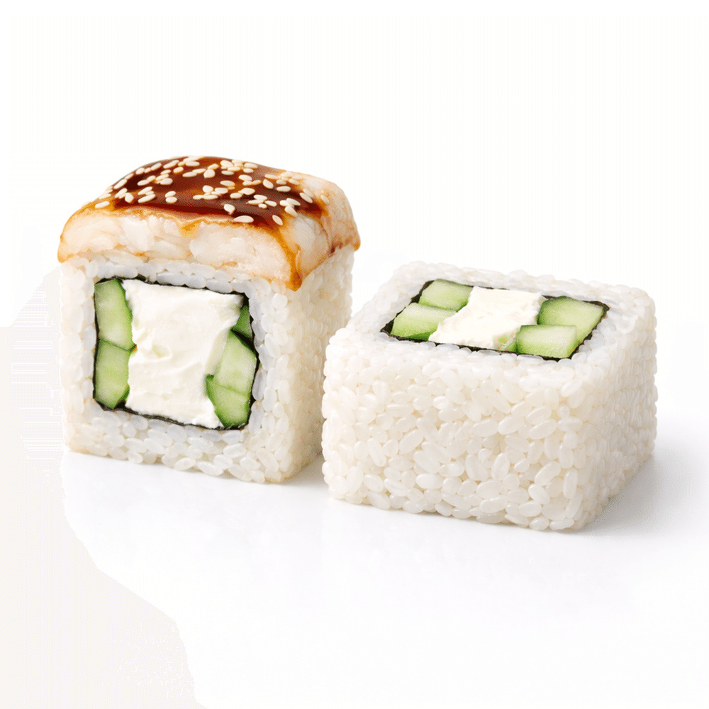 Сливочный сыр, угорь, свежий огурец, соус унаги, кунжут.