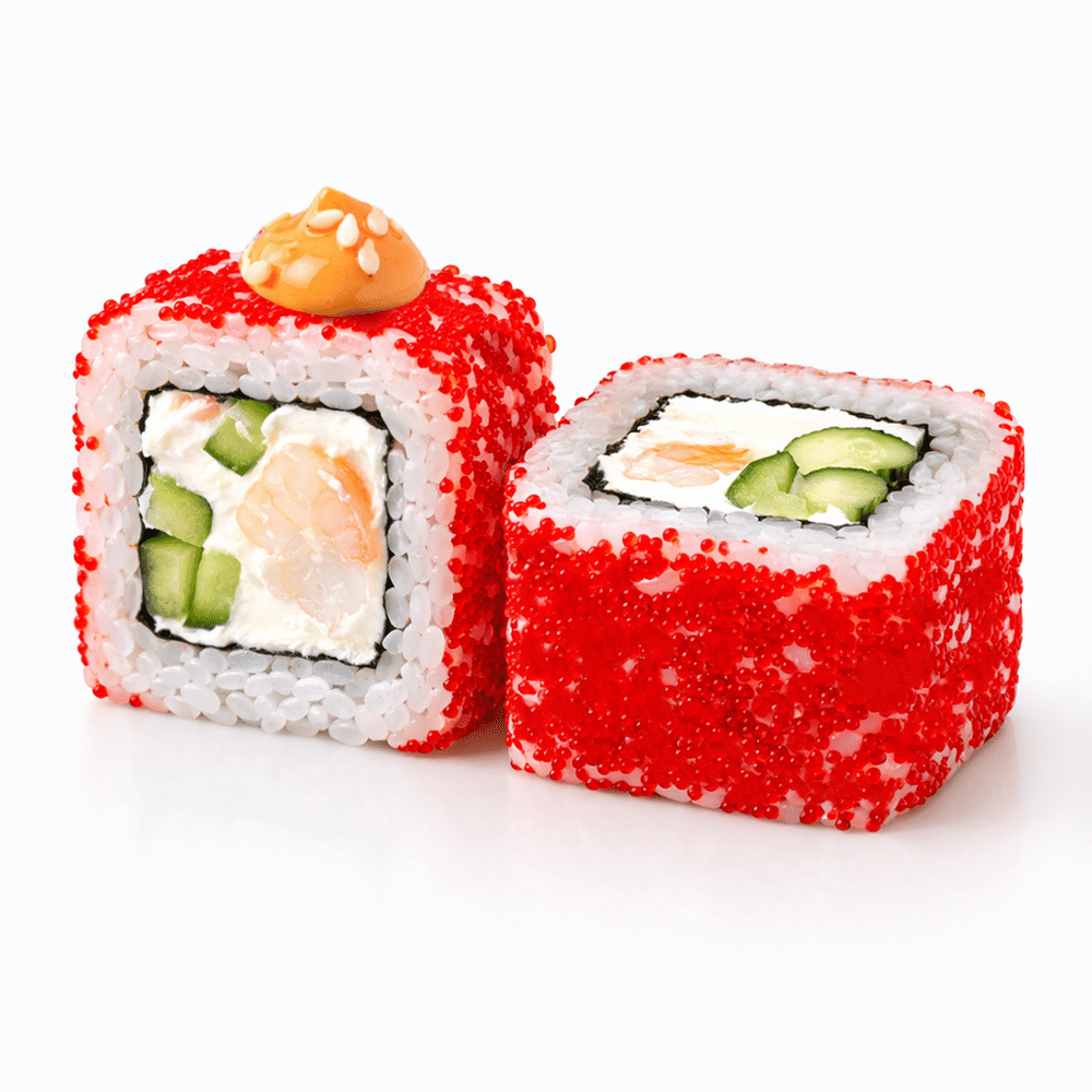 Ролл с креветками, Огурцом, Сливочным сыром и красной икрой Масаго, кимчи соусом и посыпан семенами кунжута, нори, рис.