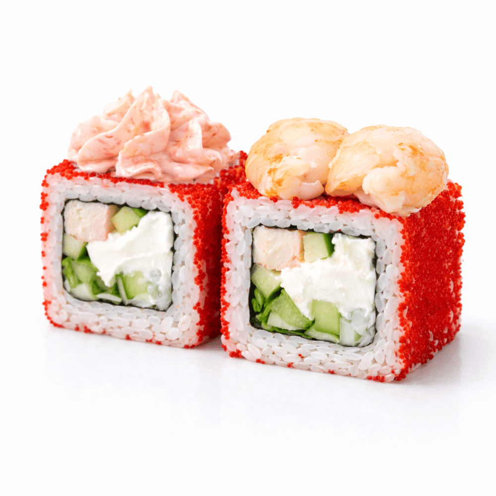 Сыр сливочный, огурец, соус лава, креветки, икра масаго, нори, рис.
