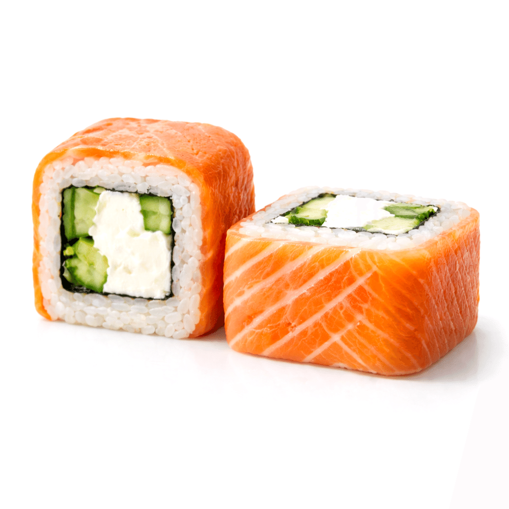 Сыр сливочный, Свежий огурчик, 1/2 Лосось, 1/2 Форель копченая, нори, рис.