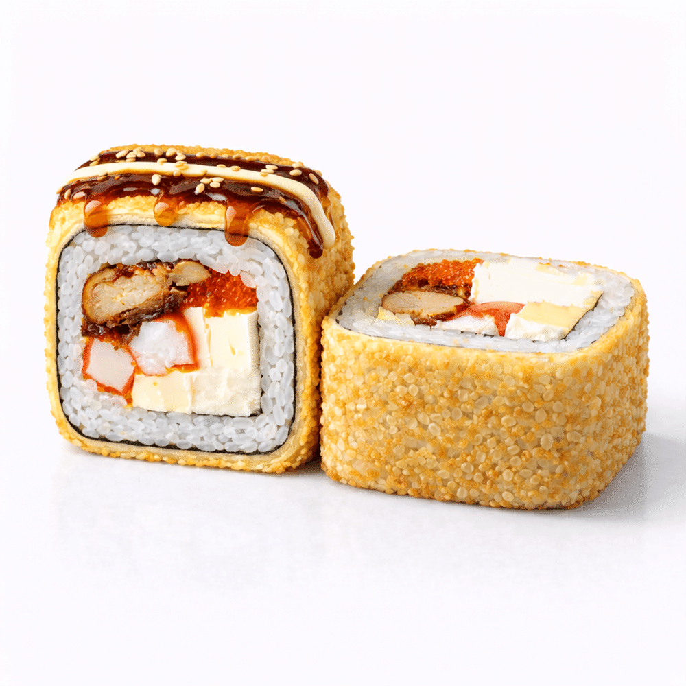 Угорь, Сурими, Сыр сливочный, красная икра Масаго, сыр Тостерный, полит двумя соусами Терияке и Чесночный, нори, рис.
