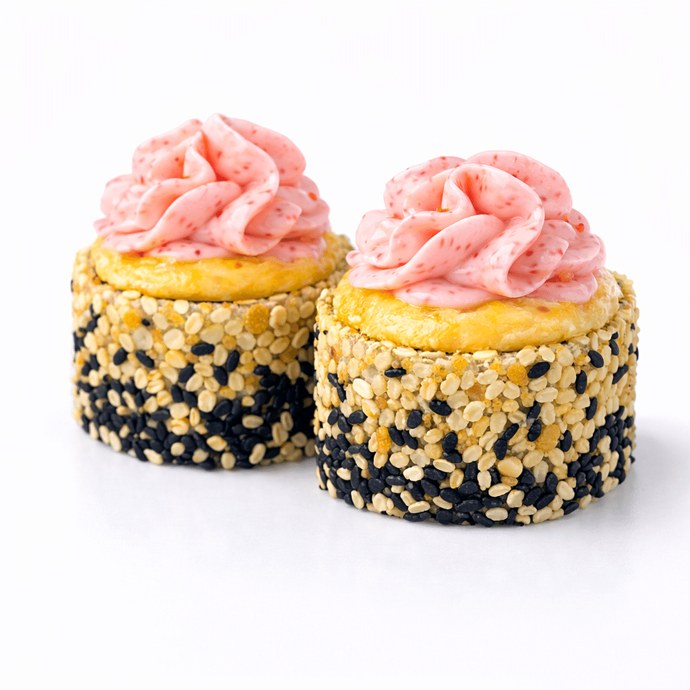 Лосось, сливочный сыр, креветки темпура, икра масаго, кунжут, соусы: копченый и лава