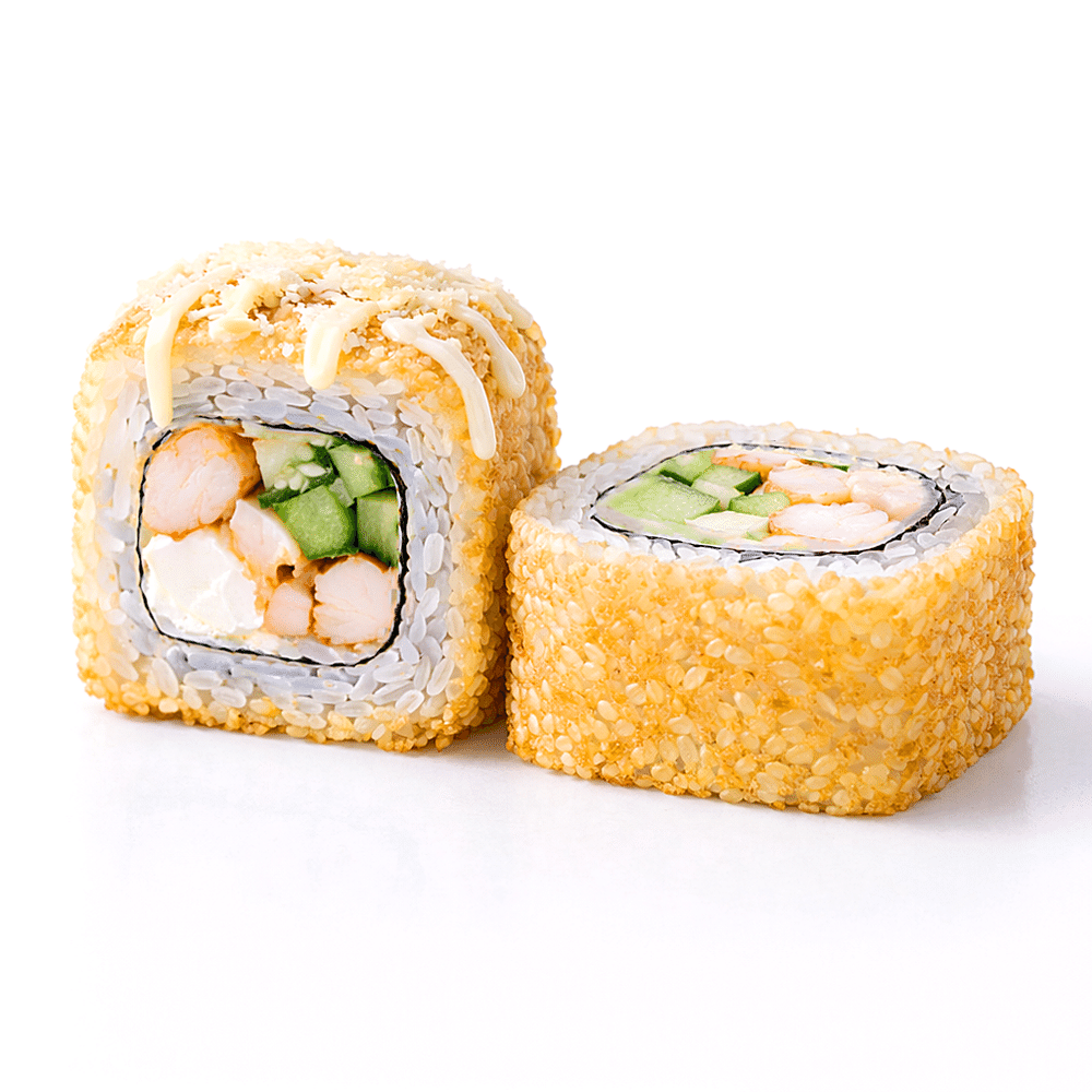 креветки, сыр сливочный, огурец, полит соусом цезарь, посыпается сыром пармезан, нори, рис.