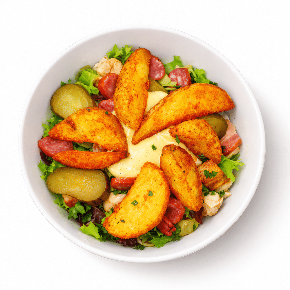 Цыпленок, Бекон, Охотничьи колбаски, Микс салат, Огурчик маринованный, Картофельные дольки, Немецкий соус, Зелень.