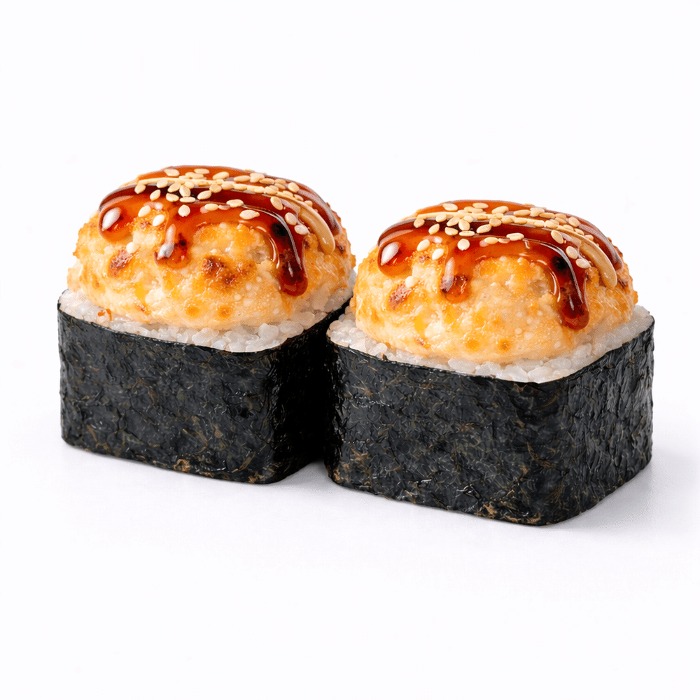 Лосось, Креветки, Сыр сливочный, фирменный соус, соус Терияке, Кунжут, нори, рис.
