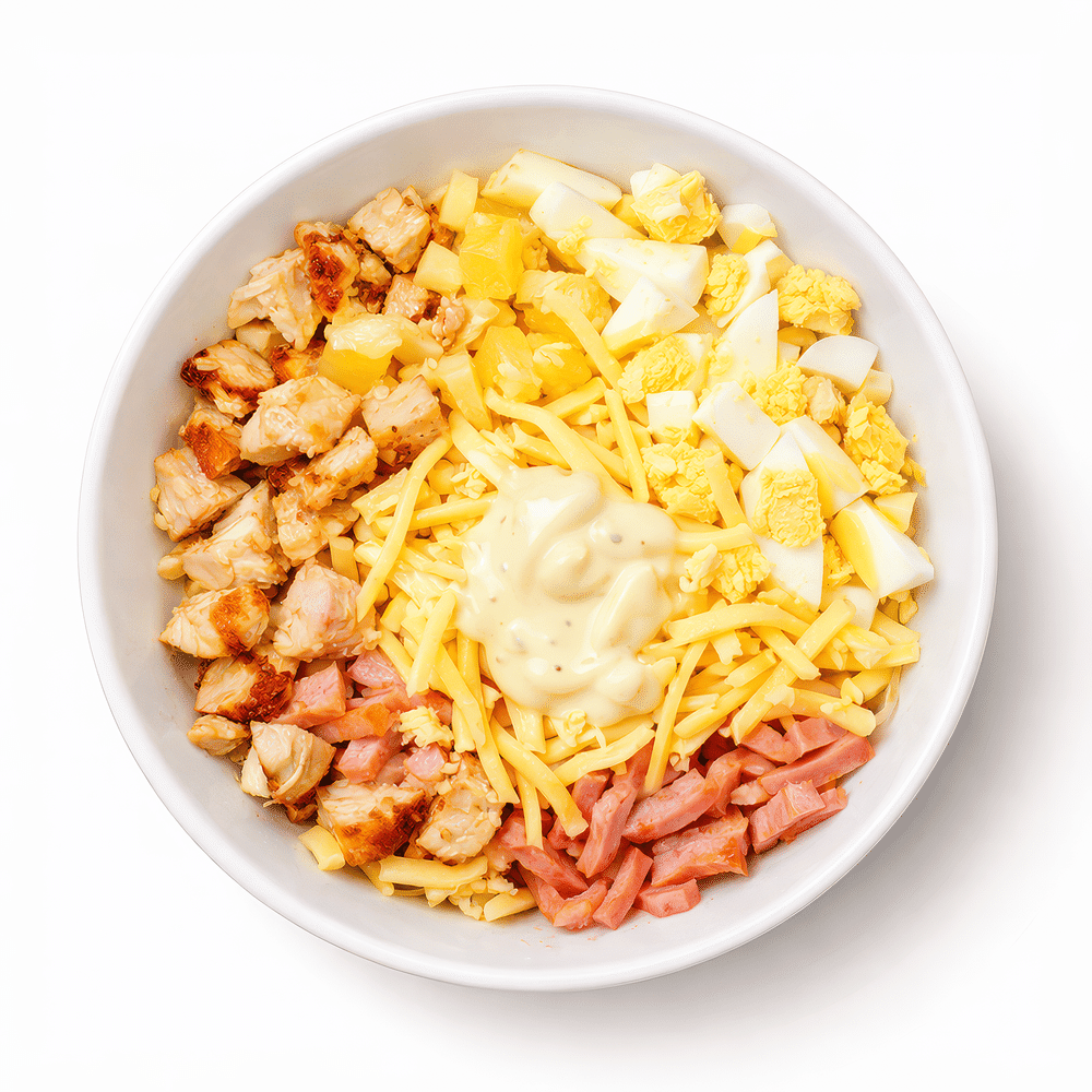 Цыпленок, Ветчина, Яйцо Куриное, Сыр Голландский, Ананас, Соус чесночный.