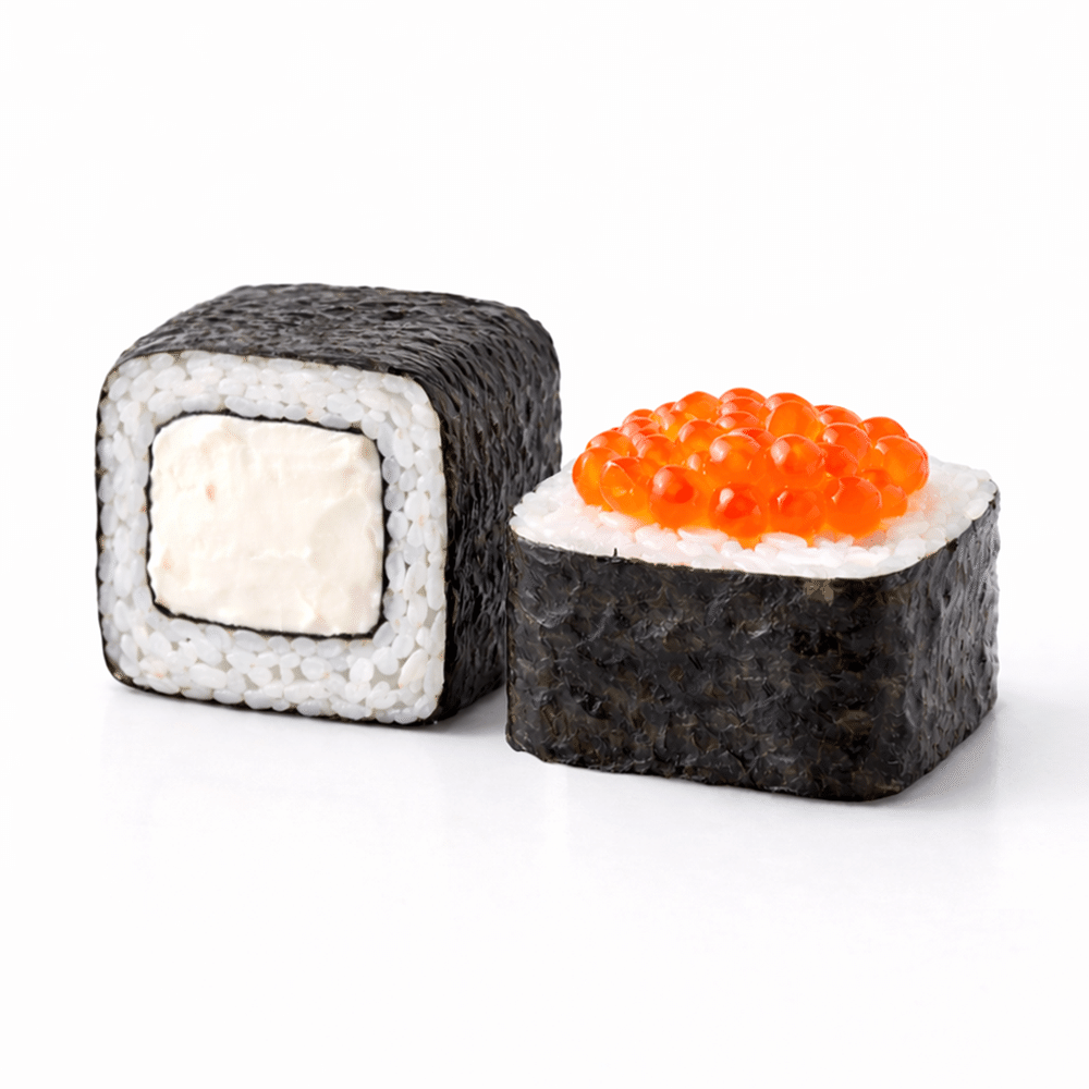 Сыр сливочный, Икра лососевая, нори, рис.
