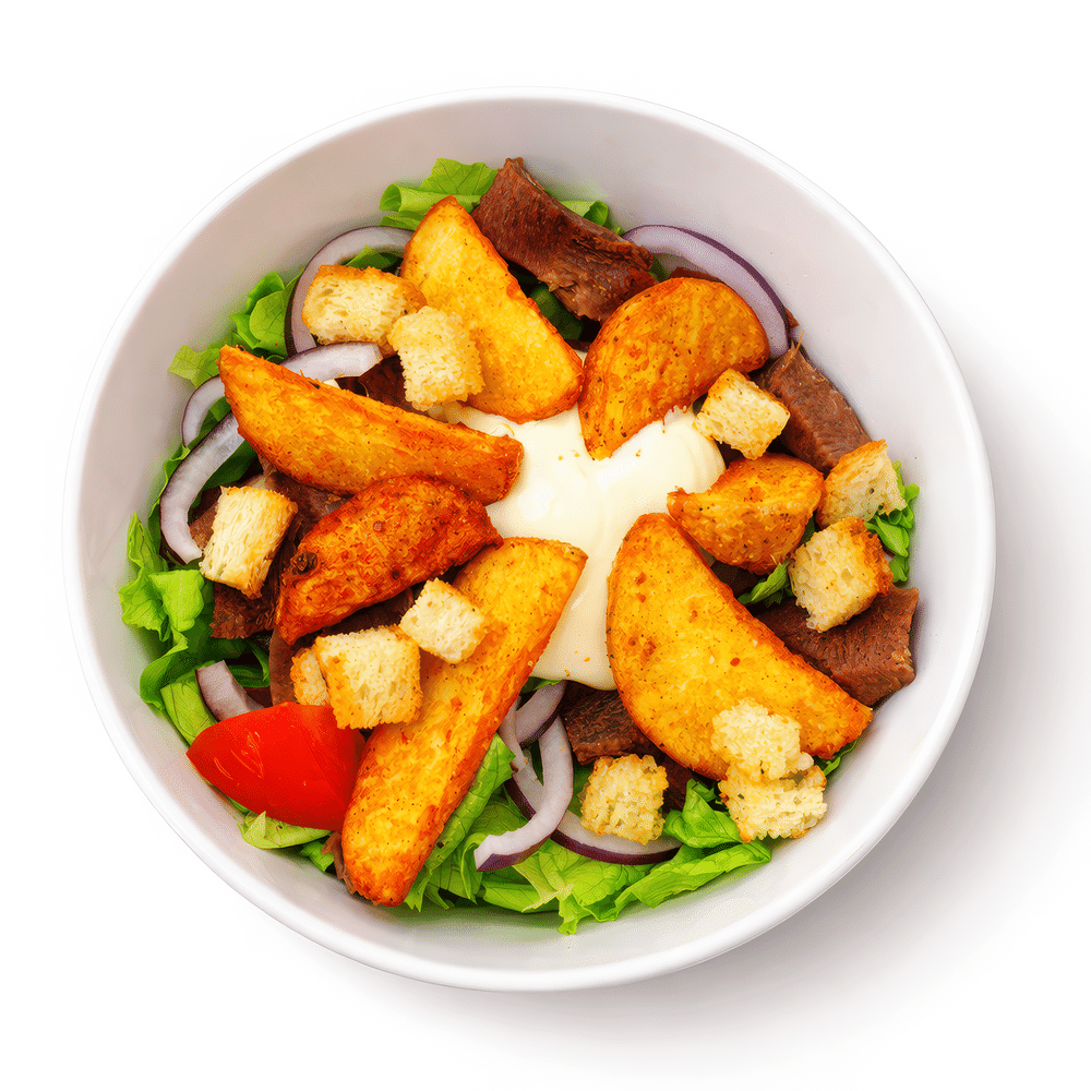 Язык отварной, Лук салатный, томаты, Лист салата, Сухарики, Картофель по деревенски.