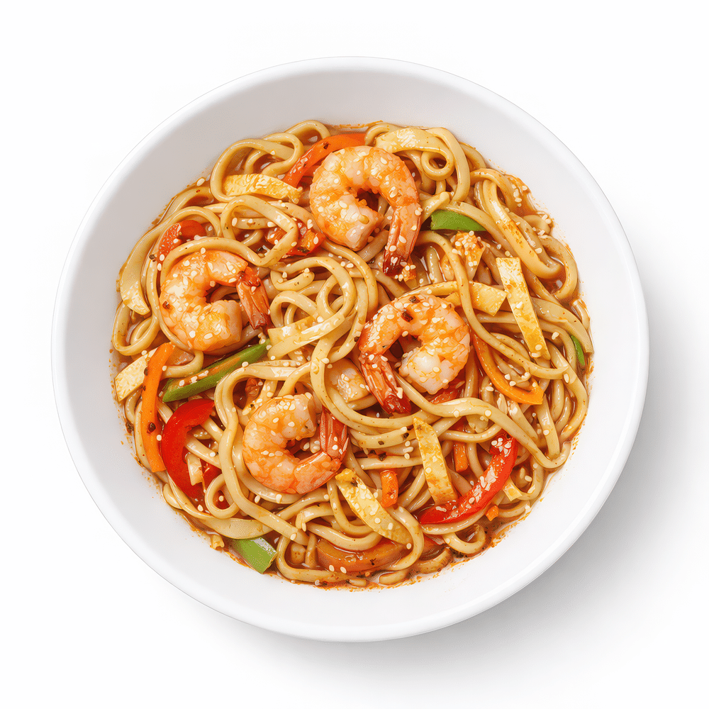 Лапша, креветки, лук репчатый, морковь, перец болгарский, яичный блинчик, соус сладкий Чили, кунжут