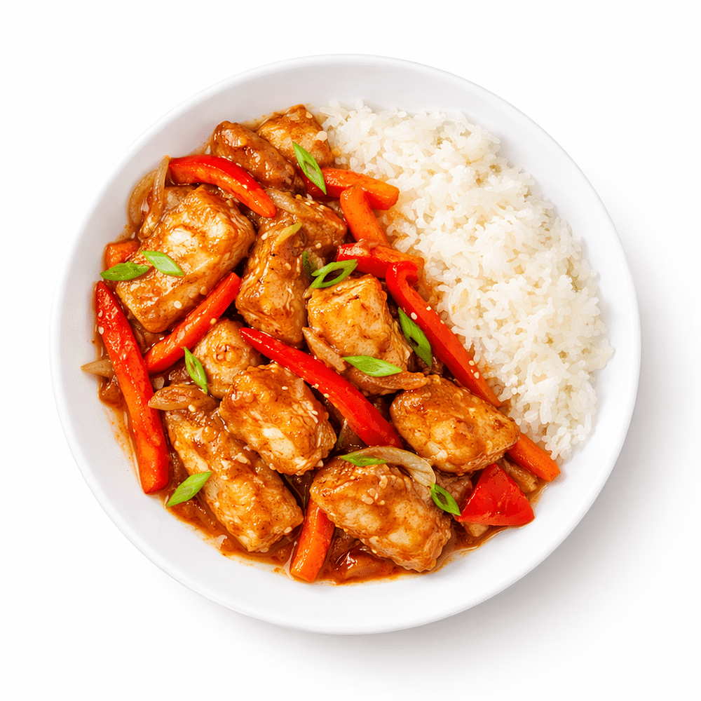 Судак, морковь, перец болгарский, кисло-сладкий соус, лук зеленый, рис отварной