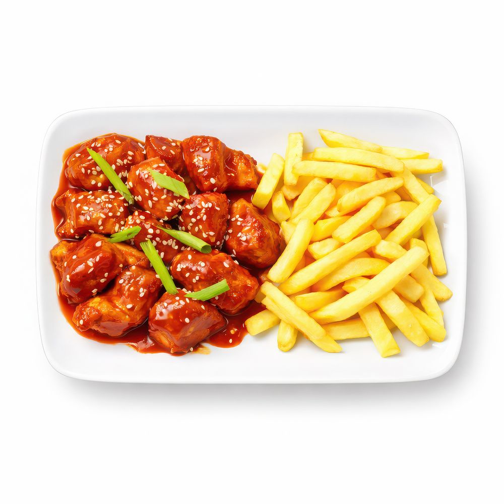 Свинина с фирменным соусом Барбекю с гарниром из Картофеля фри.