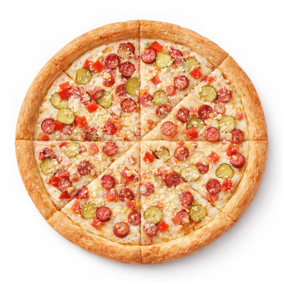Томатный соус, сыр Моцарелла, Томат, Маринованный огурец, Охотничьи колбаски.
