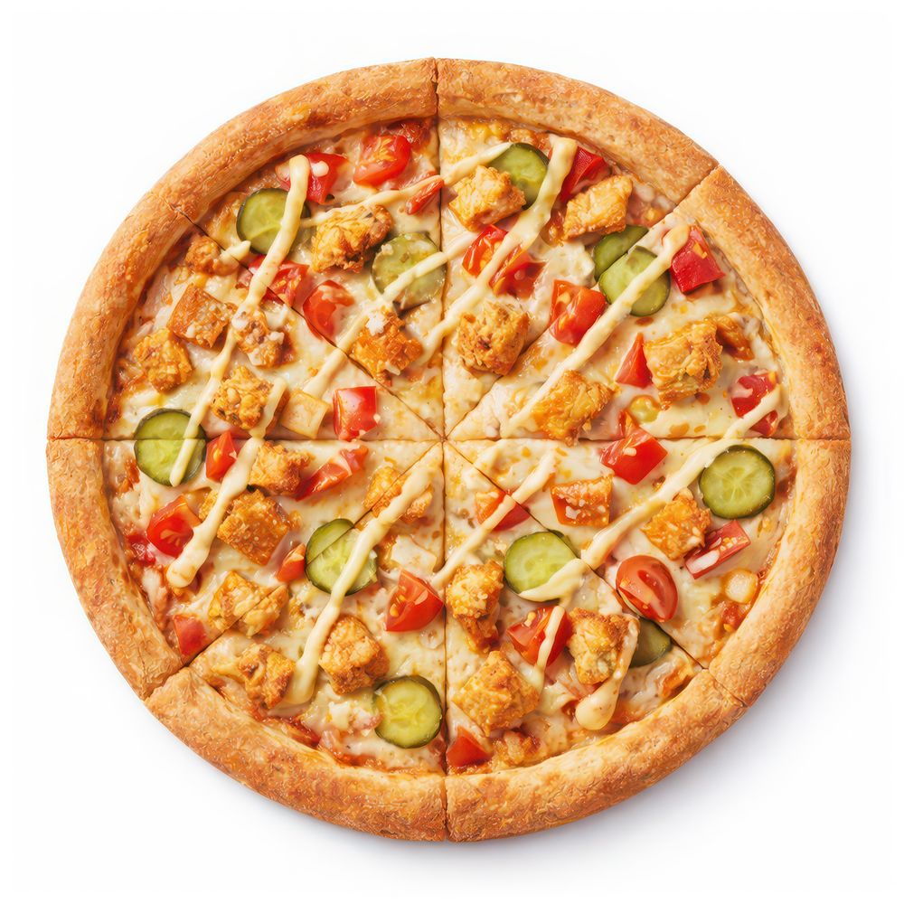 Хрустящий цыпленок, Томатный соус, сыр Моцарелла, Томаты, Маринованный огурец, полит Сырным соусом.