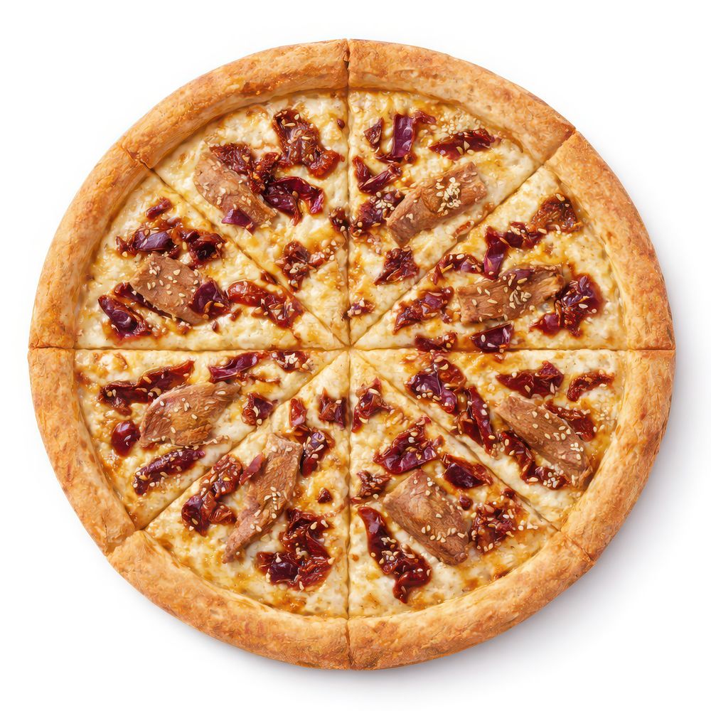 Чесночный Соус, Филе утки, Моцарелла, Вяленый томат, Карамелизированный лук, Кунжут, Соус песто