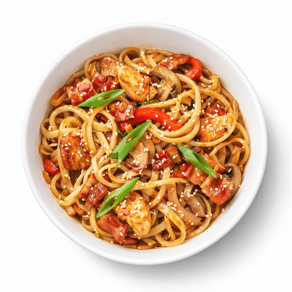 Свинина/Цыпленок, Бекон, Шампиньоны, Лук репчатый, зелень, Сладкий перец, лапша Пшеничная, Кунжут, Соус выбирается отдельно