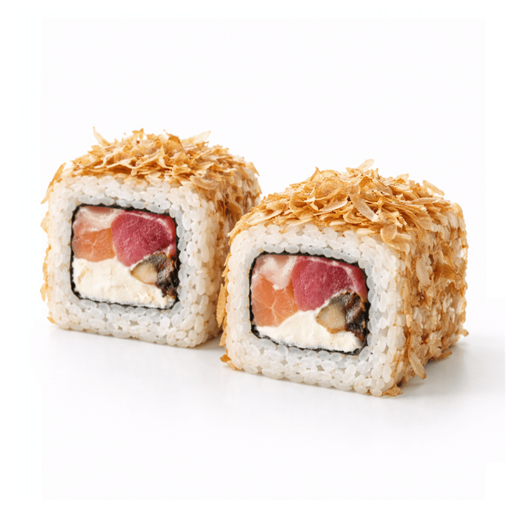 Ролл с тремя видами рыб: Лосось, Тунец и Угорь, Сливочный сыр, Посыпан стружкой тунца, нори, рис.