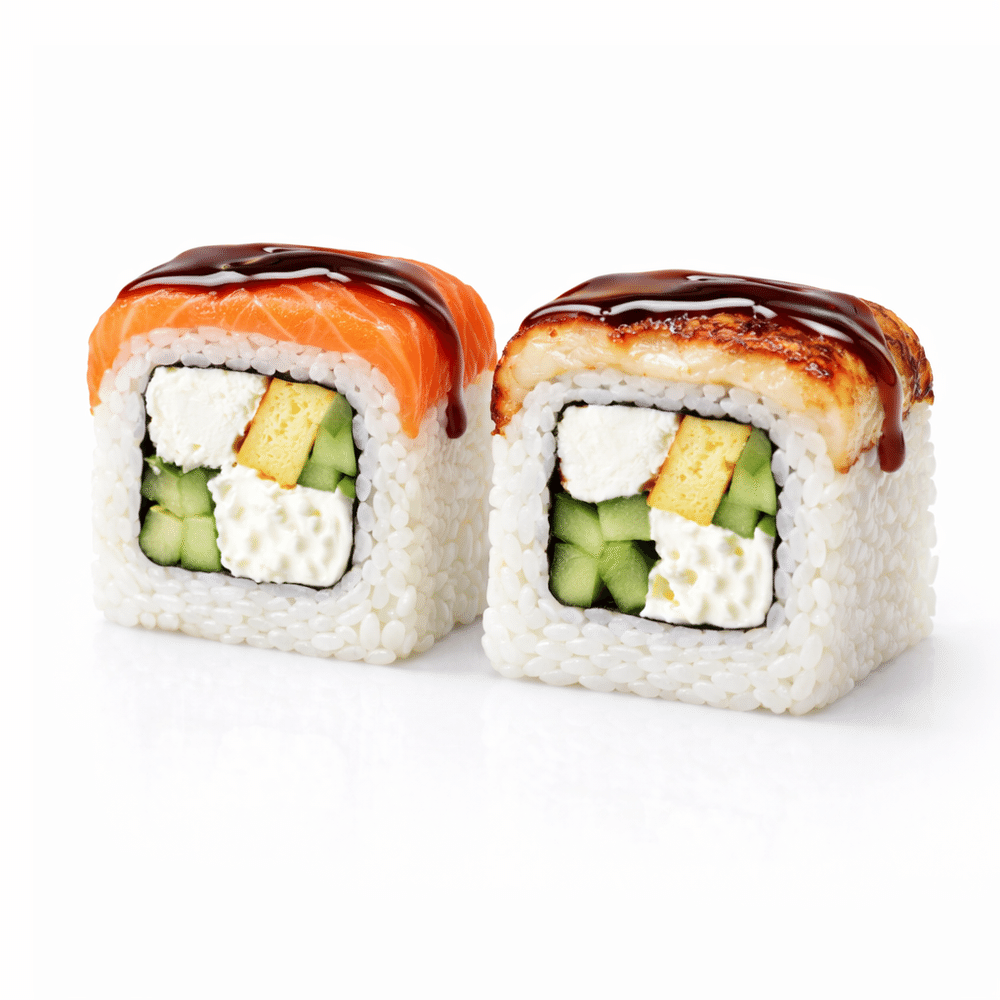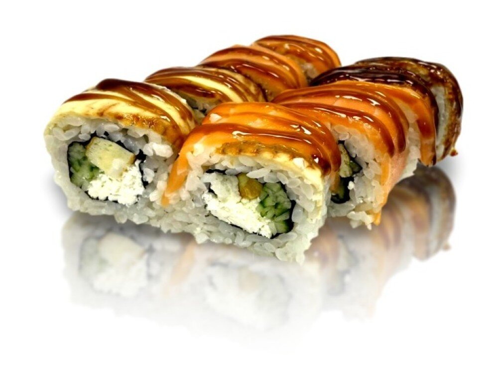 Сыр Сливочный, Свежий Огурчик, Блинчик Тамагояки, Лосось, Угорь, Полит Соусом Тэрияке, нори, рис.