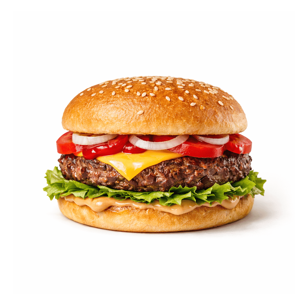 Аромантая кунжутная булочка, соус, сочная мясная котлета, лук, лист салата, свежий томат и сыр бургер.