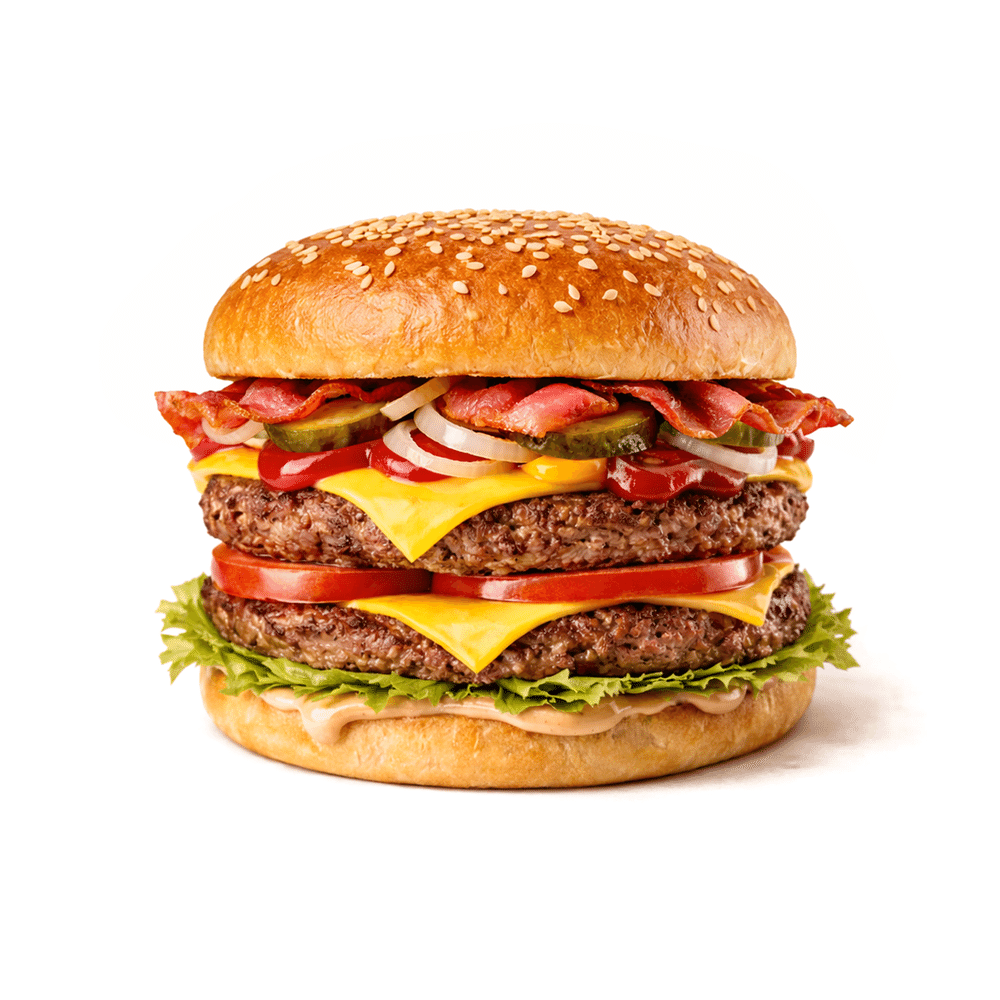 Ароматная кунжутная булочка, соус, две сочных мясных котлеты, бекон, лук, лист салата, свежий томат, сыр бургер, маринованный огурец, соус BBQ.