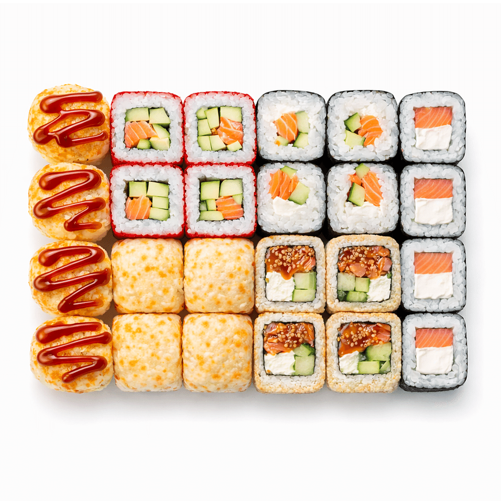 1/2 Филадельфия блек, 1/2 Чикен мак запеченный, 1/2 Тото запеченный, 1/2 Фудзи, 1/2 Чито, 1/2 Калифорния с лососем
